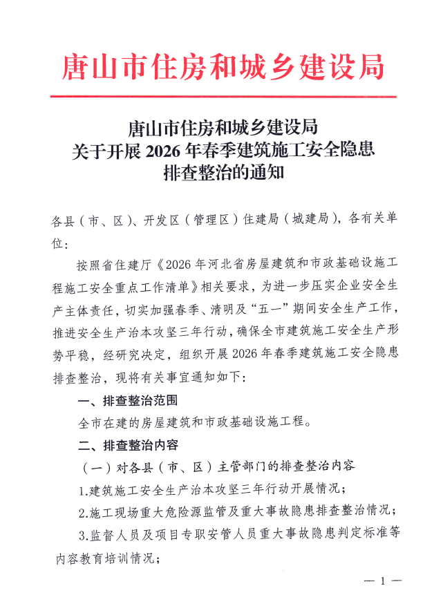 关于印发《2026年唐山市建筑施工安全生产工作要点》的通知