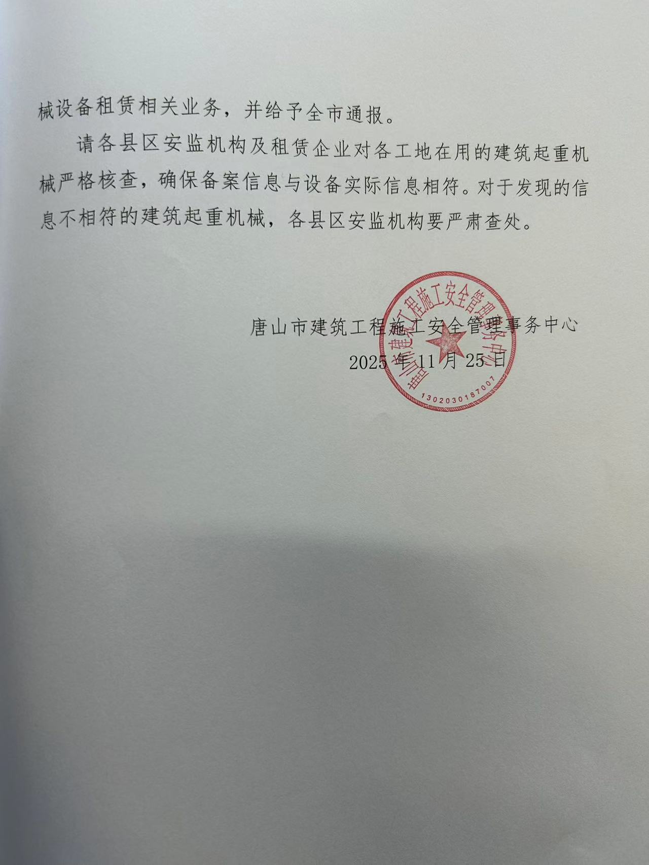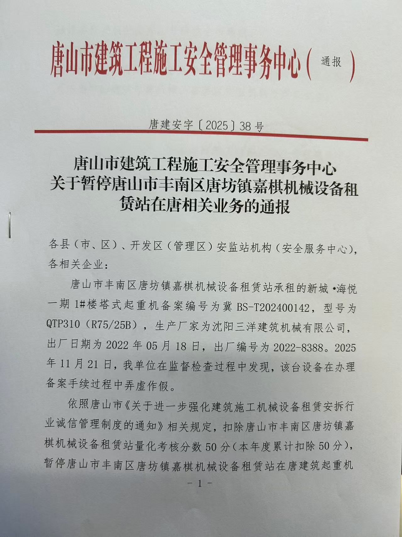 关于暂停唐山市丰南区唐坊镇嘉棋机械设备租赁站在唐相关业务的通报