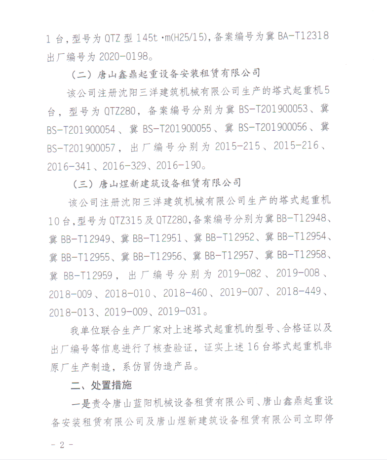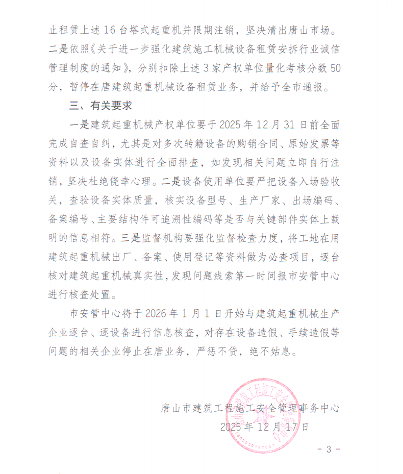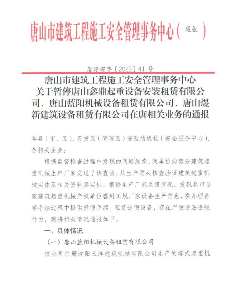 关于暂停唐山鑫鼎起重设备安装租赁有限公司、唐山蓝阳机械设备租赁有限公司、唐山煜新建筑设备租赁有限公司在唐相关业务的通报